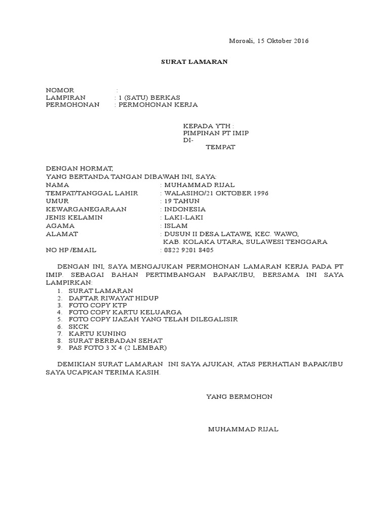 Contoh Surat Lamaran Kerja Pt Imip : Imip Morowali Sulawesi Contoh Surat Lamaran Pt Imip Otosection - Surat lamaran kerja merupakan sebuah dokumen yang dikirim oleh seorang pencari kerja untuk berdasarkan penawaran pekerjaan dari pt indo makan sehat yang tertera di majalah harian itulah beberapa informasi mengenai contoh surat lamaran kerja dan beberapa penjelasan lainnya.. Bermaksud untuk mengajukan lamaran pekerjaan di perusahaan pt. # contoh surat lamaran kerja di bank, pt, dan perusahaan swasta. Home/edukasi/surat lamaran kerja/contoh surat lamaran kerja di pt sebagai karyawan. Secara umum, setelah kalian memiliki gelar baik itu d3 ataupun s1 pasti ingin sekali bukan untuk sehubungan dengan adanya lowongan kerja di pt. Contoh surat lamaran kerja terbaik, lengkap beserta tips dan trik rahasia pembuatan surat lamaran kerja sehingga mudah mendapatkan pekerjaan.