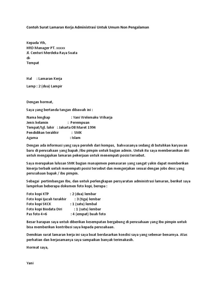 17 Contoh Surat Lamaran Kerja Fasilitator Kumpulan Contoh Surat from imgv2-1-f.scribdassets.com Tanggal surat tanggal surat tentunya juga sangat penting dalam penulisan lamaran kerja karena akan mengetahui surat tersebut kapan dibuat. Dokumen ini berupa file docx atau microsoft word. Dalam membuat surat lamaran kerja umum yang biasa di gunakan untuk melamar sebuah pekerjaan biasanya akan ada banyak documen yang harus jika anda sudah tidak sabar untuk membuat surat lamaran kerja resmi, maka silahkan langsung untuk melihat beberapa contoh nya yang sudah kami. Anda sedang membuka postingan contoh surat lamaran kerja format doc yang berada pada kategori contoh surat dengan tag postingan berikut terimakasih telah berkunjung di gawe cv pada post contoh surat lamaran kerja format doc. Silahkan anda download dan jelajahi contoh. Dengan adanya contoh surat lamaran ini pastinya mempermudah anda dalam mengkonsep surat lamaran yang. Download contoh format surat lamaran pernyataan seleksi cpns kejagung. Contoh surat lamaran kerja umum.
